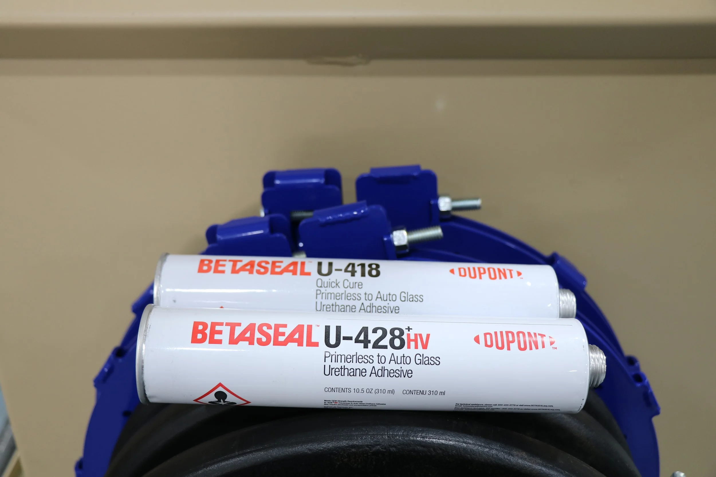 Two compression clamps showing the staggered configuration and examples of the single part urethane adhesive.