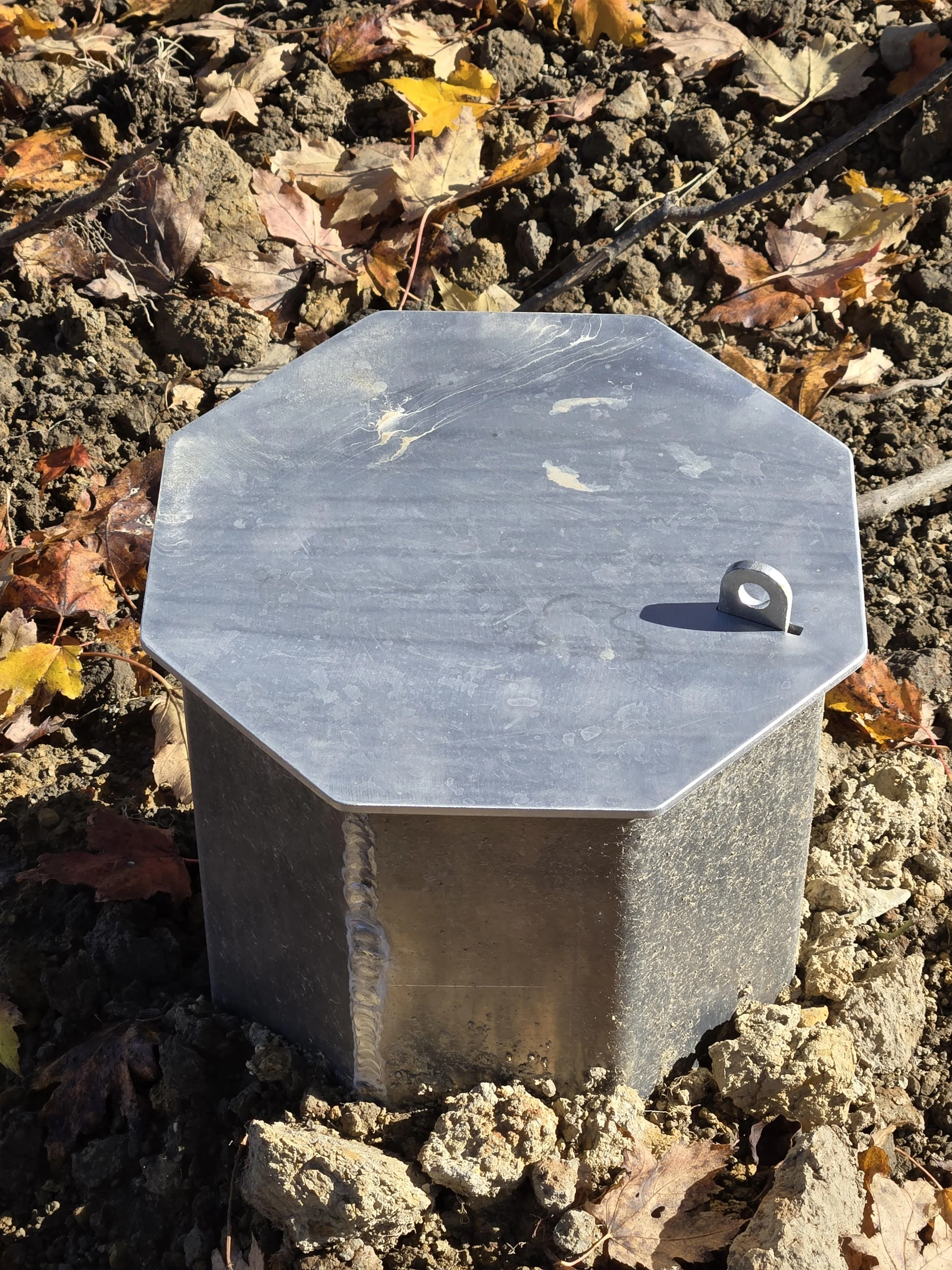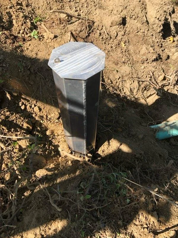 The box is buried with the the top rising slightly above the soil surface for easy access.